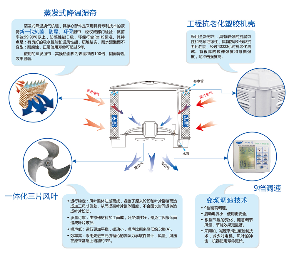 科瑞萊”蒸發式冷氣機結構示意圖及特點: